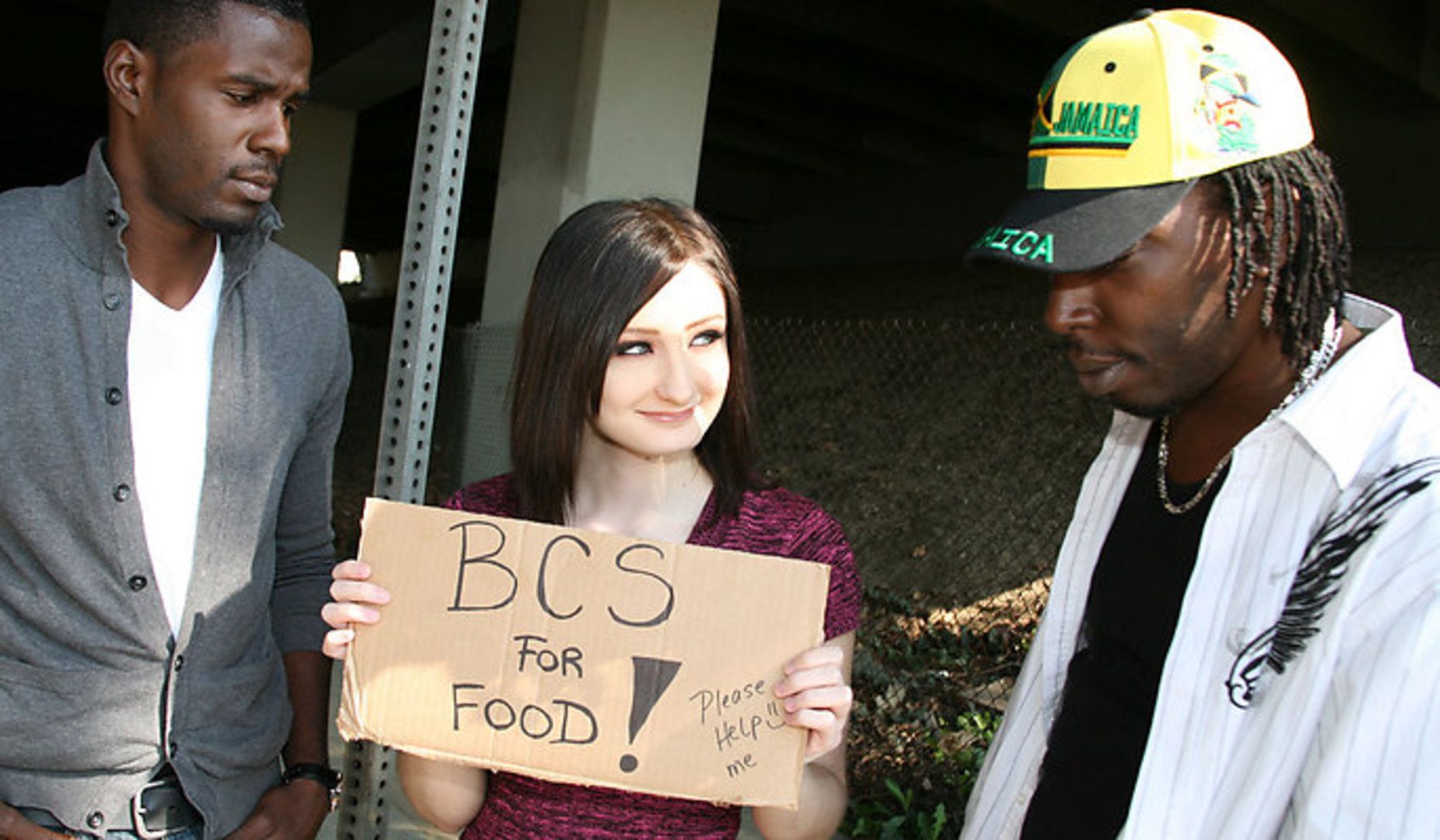 Violet is hungry, but not necessarily for food, she's hungry for black cock, and the jizz that they spew! She's out along the street with her 'BCS for food' sign, and isn't getting any response from the cars passing by. Two black dudes from the hood drop by and try to see what she wants. After they see that she is a black cock slut for food, they take her back to their crib to fulfill her needs. They get her naked and start taking turns jamming those huge black dicks down her throat. Then it's time to fuck this very white brunette girl, and they run her through a series of 2-on-1 positions that keep her mouth and pussy well occupied, until it's time to provide her with her promised meal. They each cum in a bowl, and she dines on liquid protein and licks the bowls clean!